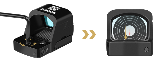 If you rotate in the direction of the arrow that says “UP” the dot will move Down, Menting the place your bullet will het moves Up.